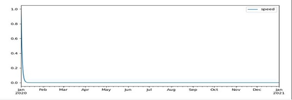 import numpy as np import pandas as pd from matplotlib import pyplot as plt rng = np.random.default_rng(seed=1) date_day = pd.date_range(start='2020-01-01', end='2021-01-01', freq='D') traffic = rng.lognormal(sigma=2, size=date_day.size) df_day = pd.DataFrame(dict(speed=[pow(2, -i) for i in range(len(date_day))]), index=date_day) df_day.plot(figsize=(10, 5)) plt.show()