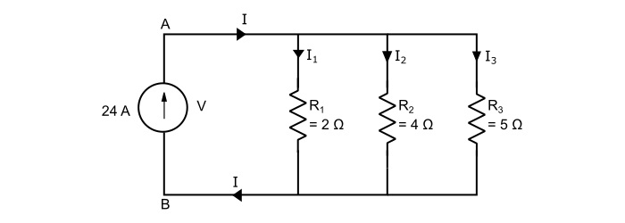 $$\mathrm{\mathit{I}_{1}=\frac{\mathit{V}}{\mathit{R}_{1}};\:\:\:\mathit{I}_{2}=\frac{\mathit{V}}{\mathit{R}_{2}}\:\:\:and\:\:\:I_{3}=\frac{\mathit{V}}{\mathit{R}_{3}};}$$
