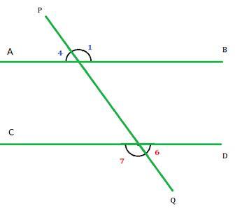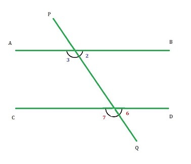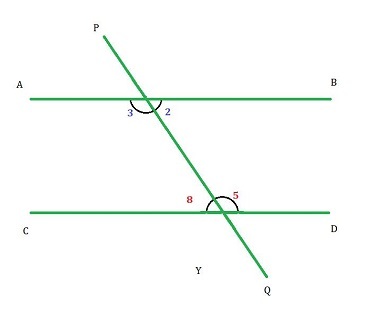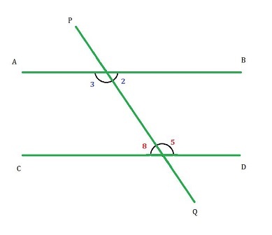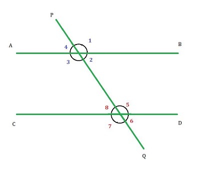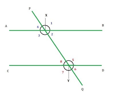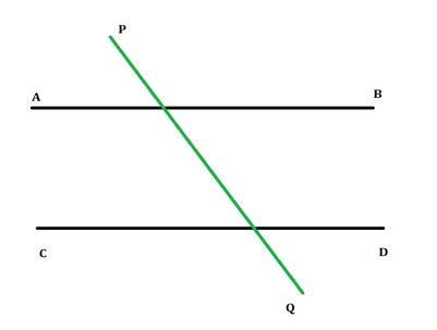 如果二維平面上的兩條平行線被第三條線在兩個不同的點處相交,則第三條線稱為橫截線。如圖所示,橫截線 PQ 在兩個點處與線 AB 和 CD 相交。橫截線與每條線形成八個不同的角,我們將在後面進一步討論。