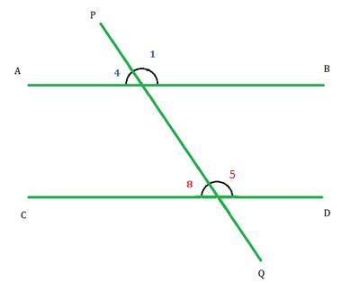 橫截線在第一條線上形成的外角和橫截線在第二條線上形成的內角在橫截線的同一側被稱為同位角。在下圖中,$\mathrm{\angle1}$ 是 $\mathrm{\angle5}$ 的同位角,$\mathrm{\angle4}$ 是 $\mathrm{\angle8}$ 的同位角。並且平行線形成的同位角彼此相等;因此,