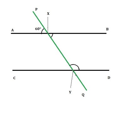 1) 在下圖中,線 AB 平行於線 CD。橫截線 PQ 在 X 和 Y 點與線相交。如果 $\mathrm{\angle\:AXP\:=\:60°}$,則求角 $\mathrm{\angle\:PYD}$。