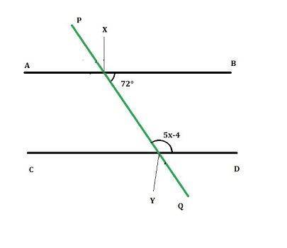答 - 已知 $\mathrm{\angle\:QXB\:=\:72°\:,\:AB\:\:\:\rvert\:\:\:CD\:,\:\angle\:PYD\:=\:5x\:-\:4}$