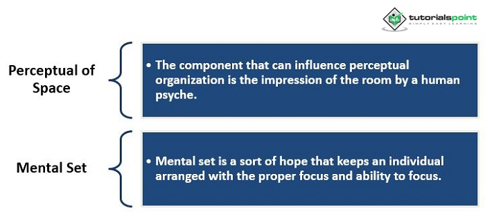 可能影響知覺組織的一個因素是人腦對空間的感知。根據這個概念,一個人傾向於在三個方面感知環境中的物體:寬度、高度和距離。心理定勢是另一個影響知覺組織的重要因素。這個術語指的是人腦準備接收感覺輸入。心理定勢是一種期望,它使一個人保持適當的注意力和集中能力。一個例子可以很容易地解釋這個影響知覺組織的概念。當你站在地鐵站時,你可以提前透過地鐵列車的喇叭聲來識別地鐵列車的出現。當你經過一個寺廟時,你可以透過聽到鐘聲或誦經來識別它,這些鐘聲或誦經會告訴你關於那個神聖地方的資訊。
