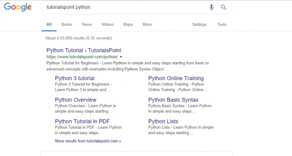 >>> =============== RESTART: C:/Python/Python361/google_search1.py =============== Input your query:Tutorialspoint