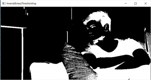 import cv2 image = cv2.imread('testimage.jpg') threshold_value = 120 max_val = 255 ret, image = cv2.threshold(image, threshold_value, max_val, cv2.THRESH_BINARY_INV) cv2.imshow('InverseBinaryThresholding', image)