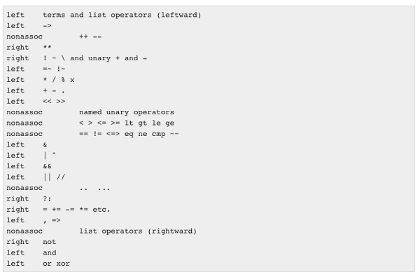 下表列出了 Perl 程式設計中從最高優先順序到最低優先順序的全部運算子。