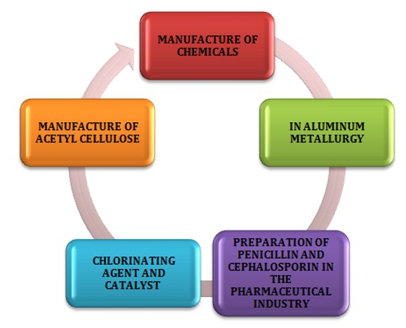 為了生產青黴素和頭孢菌素這兩種主要成分,在許多製藥工業中使用五氯化磷。五氯化磷也有助於生產醯氯。該化合物通常用作生產乙醯纖維素的有效催化劑。五氯化磷也用於縮合反應和環化反應。