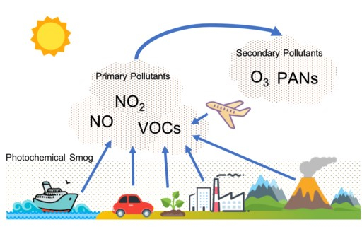 所有汙染物都可追溯到汽車排放和工業排放。大氣中的羥基主要負責一些這些烴類汙染物迅速發生氧化。它導致過氧自由基的形成,而這些自由基繼續將一氧化氮轉化為二氧化氮。