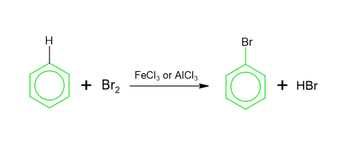 **鹵化** - 當苯與鹵素在路易斯酸存在下反應時,會生成芳基鹵化物。這被稱為鹵化反應。