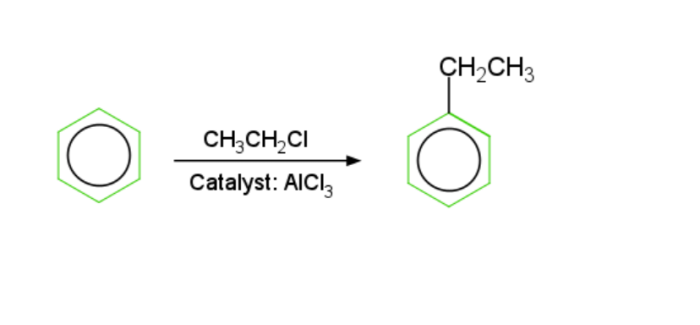 **傅-克烷基化反應** - 烷基苯是透過苯與烷基鹵化物在路易斯酸(如無水$\mathrm{AlCl_3}$)存在下的反應生成的。這被稱為傅-克烷基化反應。