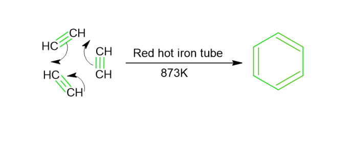 **由炔烴製備** - 在873K下,乙炔透過紅熱的鐵管,發生聚合反應生成苯。