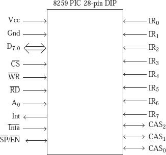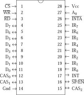 Intel 8259 設計為一個 28 引腳可程式設計積體電路,採用 DIP(雙列直插式封裝)。其物理和功能引腳圖如下所示。