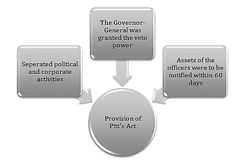 1784 年的東印度公司法案由英國首相帶到印度人民面前。這位首相以其是歐洲這個島國曆史上最年輕的首相而聞名。他當時還很年輕,只有 24 歲,但卻擁有非凡的才能,能夠進行有效的行政改革。威廉·皮特就是在這位領導人的指導下,最終促成了這項法案於 1784 年透過。