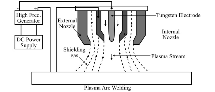 透過將電極放置在焊接炬體內部,可以使等離子弧與遮蔽氣體包絡分離。然後,等離子體被強制透過一個細孔銅噴嘴,該噴嘴會限制電弧,並且等離子體以高速從噴嘴孔口排出,溫度接近 2000 °C。