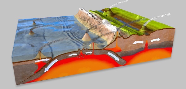 當一塊重板塊滑到一塊輕板塊下方並將輕板塊抬升時,就會導致火山爆發。