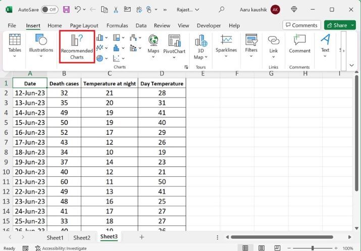 選擇完整資料,然後轉到“插入”選項卡,單擊突出顯示的“推薦圖表”,如下圖所示: