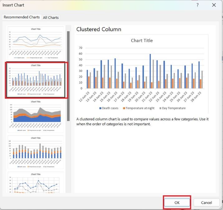 將出現另一個名為“插入圖表”的對話方塊,然後選擇第二個選項“聚類圖表”,然後單擊“確定”按鈕。