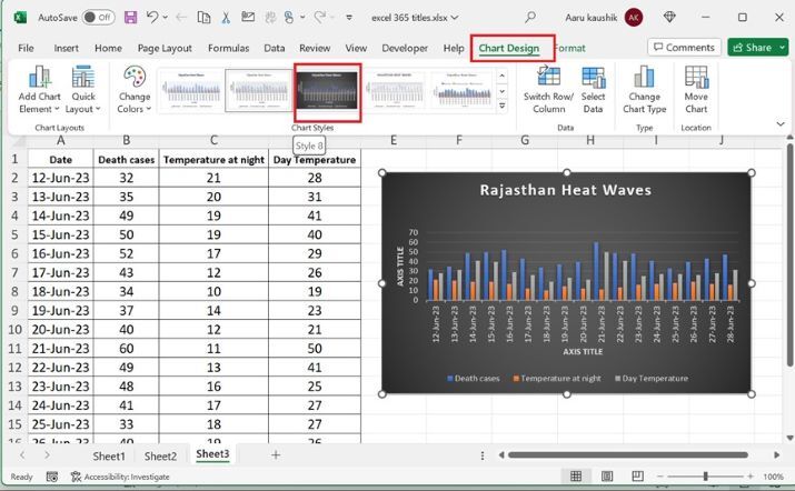 現在,更改繪製圖表的樣式。使用者需要單擊圖表區域,然後轉到“圖表設計”選項卡,然後單擊“樣式 8”。因此,圖表的樣式將被更改。