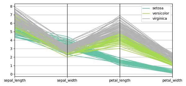 將載入的資料傳遞給 parallel_coordinates() 方法中,這將幫助我們進行平行繪圖。