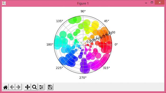 import numpy as np import matplotlib.pyplot as plt plt.rcParams["figure.figsize"] = [7.50, 3.50] plt.rcParams["figure.autolayout"] = True N = 150 r = 2 * np.random.rand(N) theta = 2 * np.pi * np.random.rand(N) area = 200 * r**2 colors = theta fig = plt.figure() ax = fig.add_subplot(projection='polar') c = ax.scatter(theta, r, c=colors, s=area, cmap='hsv', alpha=0.75) plt.show()