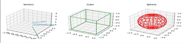 使用 ax.set_title("圖形名稱") 設定圖形標題。使用 ax.quiver 方法繪製向量投影,使用 plot3D 繪製立方體,並在使用正弦和餘弦後使用 plot_wireframe 繪製球體。