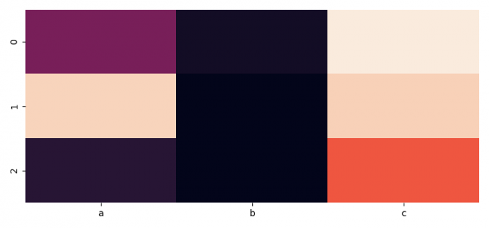 import seaborn as sns import pandas as pd import numpy as np import matplotlib.pyplot as plt plt.rcParams["figure.figsize"] = [7.50, 3.50] plt.rcParams["figure.autolayout"] = True df = pd.DataFrame(np.random.random((3, 3)), columns=["a", "b", "c"]) sns.heatmap(df, cbar=False) plt.show()