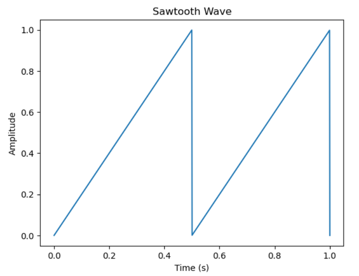 此時,它迅速下降回最小值或零幅度,完成一個週期。由於其諧波含量和獨特的特性,鋸齒波常用於音樂合成、調製技術和數字訊號處理。