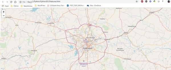 #Import library import folium #Uses lat then lon. & zoomlevel 4.The bigger the zoom number, the closer in you get. mapOBJ = folium.Map(location=[17.3616, 78.4747], zoom_start = 4, tiles = 'Stamen Terrain') # save method of Map object, will create a map mapOBJ.save('map2.html')