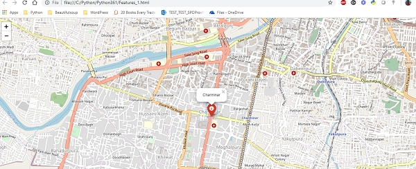 import folium from folium import features m = folium.Map([17.3616, 78.4747], zoom_start = 15) mk = features.Marker([17.3616, 78.4747]) pp = folium.Popup('Charminar') ic = features.Icon(color='red') mk.add_child(ic) mk.add_child(pp) m.add_child(mk) m.save('Features_1.html')