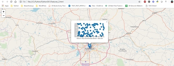 import folium from folium import features import numpy as np import json import vincent N = 100 multi_iter2 = { 'x': np.random.uniform(size=(N,)), 'y': np.random.uniform(size=(N,)), } scatter = vincent.Scatter(multi_iter2, iter_idx='x', height=100, width=200) data = json.loads(scatter.to_json()) m = folium.Map([17.3616, 78.4747], zoom_start=10) mk = features.Marker([17.3616, 78.4747]) p = folium.Popup('Charminar') v = features.Vega(data, width='100%', height='100%') mk.add_child(p) p.add_child(v) m.add_child(mk) m.save('Features_2.html')