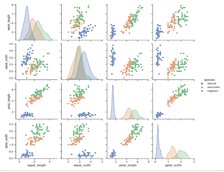 最後,我們使用Seaborn和Matplotlib繪製圖形。我們使用sns.set(style="ticks")將Seaborn樣式設定為“ticks”。此步驟是可選的,僅影響繪圖的整體外觀。Seaborn的pairplot()函式用於建立散點圖矩陣,其中每對特徵都相互繪製。iris DataFrame作為資料引數傳遞給pairplot()。hue="species"引數確保散點圖中的點根據鳶尾花的種類著色。這使我們能夠視覺化不同特徵對之間的關係,並觀察它們與不同鳶尾花種類之間的關係。