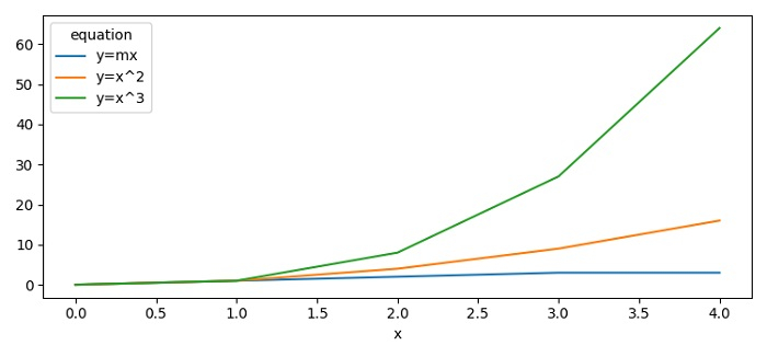 import pandas as pd from matplotlib import pyplot as plt plt.rcParams["figure.figsize"] = [7.50, 3.50] plt.rcParams["figure.autolayout"] = True df = pd.DataFrame([ ["y=x^3", 0, 0], ["y=x^3", 1, 1], ["y=x^3", 2, 8], ["y=x^3", 3, 27], ["y=x^3", 4, 64], ["y=x^2", 0, 0], ["y=x^2", 1, 1], ["y=x^2", 2, 4], ["y=x^2", 3, 9], ["y=x^2", 4, 16], ["y=mx", 0, 0], ["y=mx", 1, 1], ["y=mx", 2, 2], ["y=mx", 3, 3], ["y=mx", 4, 3], ], columns=['equation', 'x', 'y']) df = df.pivot(index='x', columns='equation', values='y') df.plot() plt.show()