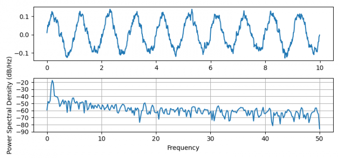 import matplotlib.pyplot as plt import numpy as np plt.rcParams["figure.figsize"] = [7.50, 3.50] plt.rcParams["figure.autolayout"] = True dt = 0.01 t = np.arange(0, 10, dt) nse = np.random.randn(len(t)) r = np.exp(-t / 0.05) cnse = np.convolve(nse, r) * dt cnse = cnse[:len(t)] s = 0.1 * np.sin(2 * np.pi * t) + cnse fig, (ax0, ax1) = plt.subplots(2, 1) ax0.plot(t, s) ax1.psd(s, 512, 1 / dt) plt.show()