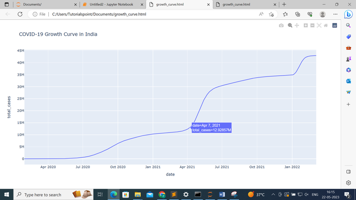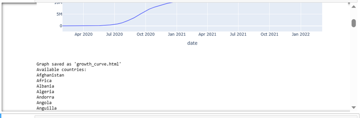 它將向我們顯示圖表和可用國家/地區的列表,從中我們可以選擇任何國家/地區,並且圖表將儲存為“growth_curve.html”。