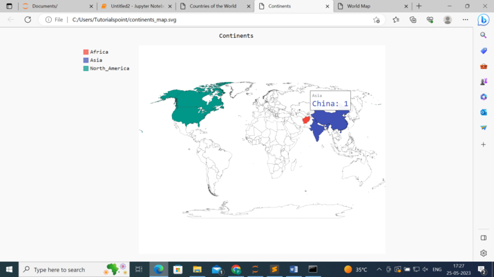 **將地圖渲染到SVG檔案** - 最後,世界地圖使用**`render_to_file()`**方法渲染到名為**'continents_map.svg'**的SVG檔案中。這將生成帶有突出顯示的大陸的世界地圖的視覺化表示。