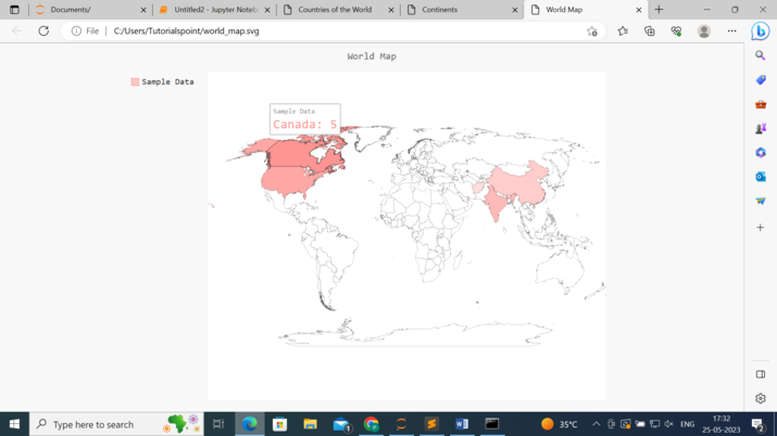 **向地圖新增資料(可選)** - 程式使用世界地圖物件的add()方法向地圖新增資料。在此示例中,資料作為字典提供,其中鍵是兩位字母的國家程式碼(例如,阿富汗為“af”,中國為“cn”,印度為“in”,美國為“us”,加拿大為“ca”),值代表每個國家的關聯資料。