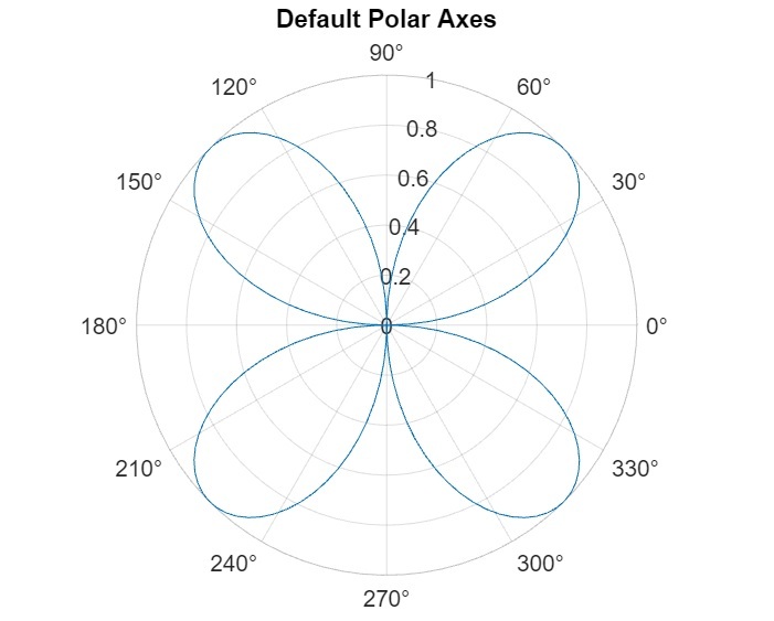 % MATLAB code to create default polar axes % Create a default polar axes polaraxes; % Sample data to create a polar plot theta = linspace(0, 2*pi, 150); value = sin(2*theta); % Plot data on the polar axes polarplot(theta, value); title('Default Polar Axes');