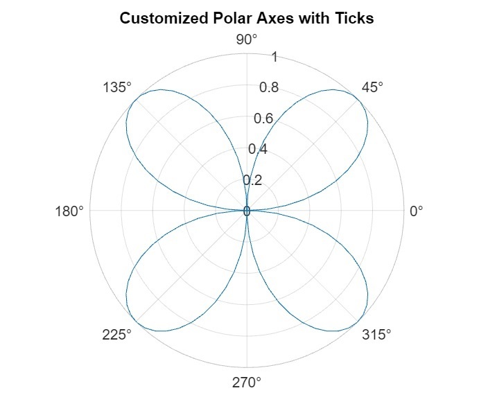 % MATLAB code to add customized axes ticks % Creating default polar axes ax = polaraxes; % Defining Sample data to create a polar plot theta = linspace(0, 2*pi, 100); value = sin(2*theta); % Creating a polar plot polarplot(ax, theta, value); title('Customized Polar Axes with Ticks'); % Adding axes ticks to polar axes ax.ThetaTick = [0:45:315]; ax.RTick = [0:0.2:1];