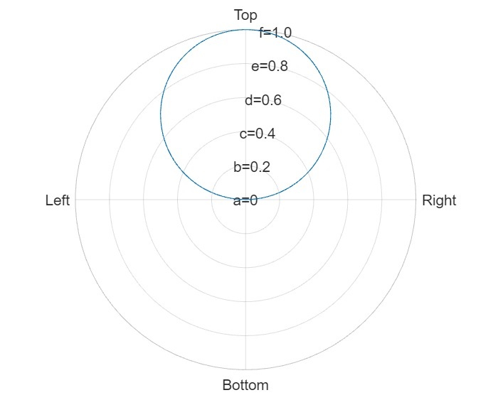 % MATLAB code to customize polar axes tick labels % Create a polar axis ax = polaraxes; % Create data for polar plot t = linspace(0, 2*pi, 100); r = sin(t); % Create a polar plot of the data polarplot(ax, t, r); % Customize polar axes ticks and labels rticks([0, 0.2, 0.4, 0.6, 0.8, 1.0]); % Radial axis ticks % Radial axis tick labels rticklabels({'a=0', 'b=0.2', 'c=0.4', 'd=0.6', 'e=0.8', 'f=1.0'}); thetaticks([0, 90, 180, 270]); % Theta axis ticks % Theta axis tick labels thetaticklabels({'Right', 'Top', 'Left', 'Bottom'});