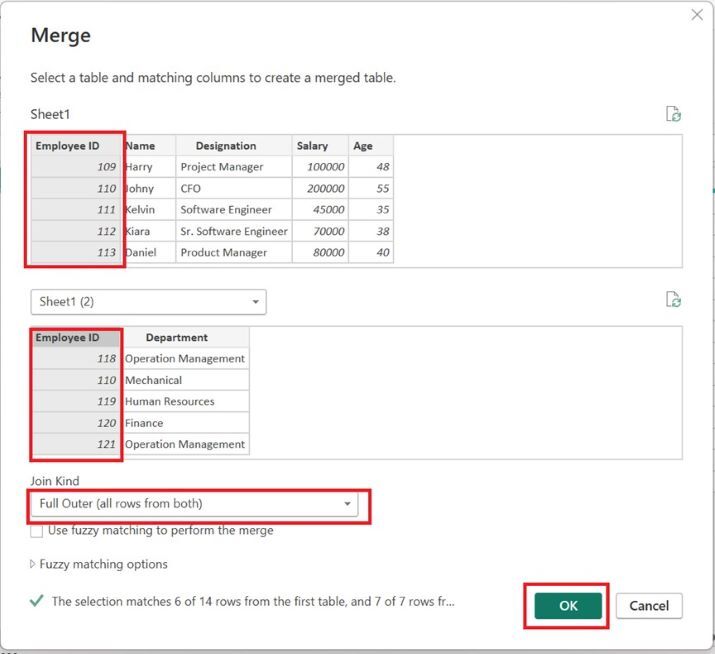 “合併”對話方塊將開啟,使用者可以在其中選擇兩個表中的“員工ID”列,因為它包含一些公共ID。現在,從“聯接型別”下提供的列表中選擇“完全外部(兩個表的所有行)”,然後點選“確定”按鈕。