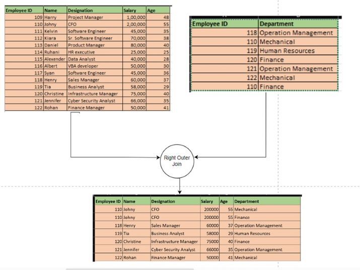 假設我們有兩個名為Employee和Department的表。employee 表包含五列:員工 ID、姓名、職位、薪水和年齡。department 表包含兩列:員工 ID 和部門。我們必須應用右外部聯接來合併這些表。