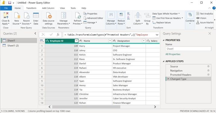 您可以看到兩個表已匯入 Power BI Desktop。單擊“資料”部分下的Sheet1後,將顯示 Employee 表的完整資訊,如下圖所示: