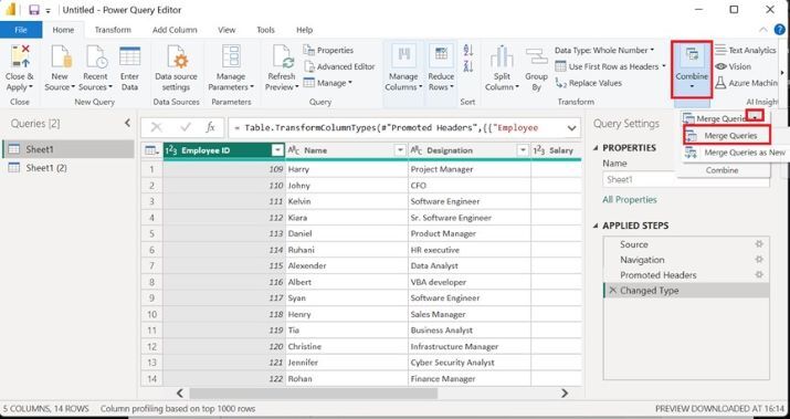 Power Query 編輯器視窗將出現。單擊“合併”磁貼,展開“合併查詢”磁貼,然後選擇“合併查詢”選項,如下所示: