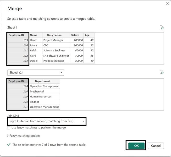 將開啟合併對話方塊,使用者可以在其中選擇兩個表中的“員工 ID”列,因為它包含一些公共 ID。現在,從“聯接型別”下提供的列表中選擇“右外部(全部來自第二個表,匹配來自第一個表)”,然後單擊確定按鈕。