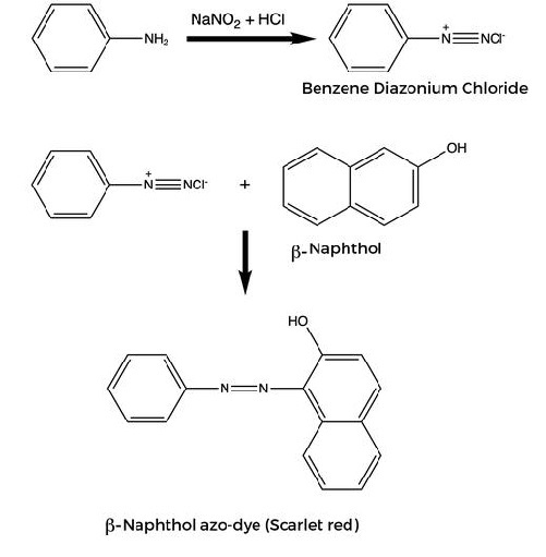 當亞硝酸酐與苯胺”反應時,會生成硝基胺衍生物。然而,硝基胺衍生物本質上不穩定,並異構化為形成二乙酸。它有助於轉化為重氮鹽。在氫氧化鈉的存在下,重氮鹽與 2-萘酚反應,結果產生 2-萘酚苯胺,這是一種苯胺染料。