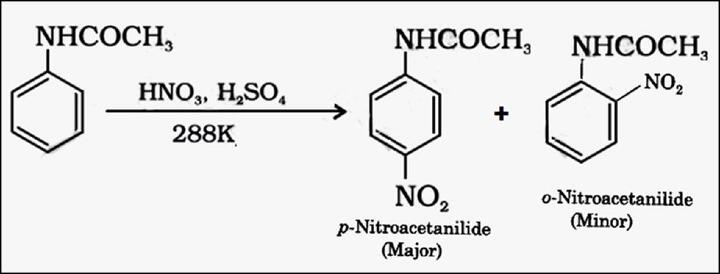 用硝酸和硫酸的硝化混合物處理乙醯苯胺,會生成鄰硝基乙醯苯胺作為次要產物。該產物高度溶於醇,易於透過結晶分離。下圖顯示了利用乙醯苯胺硝化製備對硝基乙醯苯胺的化學反應。
