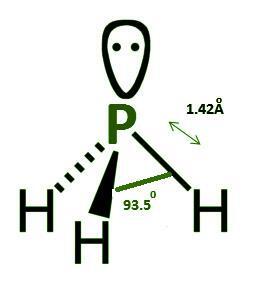 磷化氫的幾何結構是三角雙錐形,其中 P 原子上有一對電子,以及三個 P-H 鍵,鍵長為 1.42 Å。