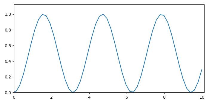 import numpy as np import matplotlib.pyplot as plt plt.rcParams["figure.figsize"] = [7.00, 3.50] plt.rcParams["figure.autolayout"] = True x = np.linspace(-10, 10, 100) y = np.sin(x) ** 2 plt.plot(x, y) plt.xlim([0, max(x)+0.125]) plt.ylim([0, max(y)+0.125]) plt.show()