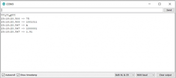 如你所見,這僅適用於整數和字元,而不適用於浮點數字。對於字元,將列印該字元的 ASCII 等效項的二進位制值。你可以訪問此處的 ASCII 表:https://www.cs.cmu.edu/~pattis/15-1XX/common/handouts/ascii.html。對於負整數,結果有點奇怪。例如,Serial.print(-75,BIN) 會輸出 11111111111111111111111110110101,它轉換為十進位制值 4294967221,對應於 (2^32 – 75)。所以本質上,列印的值對應於整數溢位。當然,這種輸出將在使用 4 個位元組(32 位)來表示整數的板上顯示。如果你使用的是使用兩個位元組(16 位)來表示整數的板,輸出將是 (2^16 – 75)。