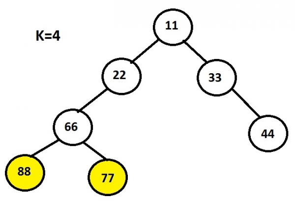 ",root->data); } else if (level > 1) { leaf(root->left, level - 1); leaf(root->right, level - 1); } } int main() { printf("leaf nodes are: "); struct node* root = New(11); root->left = New(22); root->right = New(33); root->left->left = New(66); root->right->right = New(44); root->left->left->left = New(88); root->left->left->right = New(77); int level = 4; leaf(root, level); return 0; }